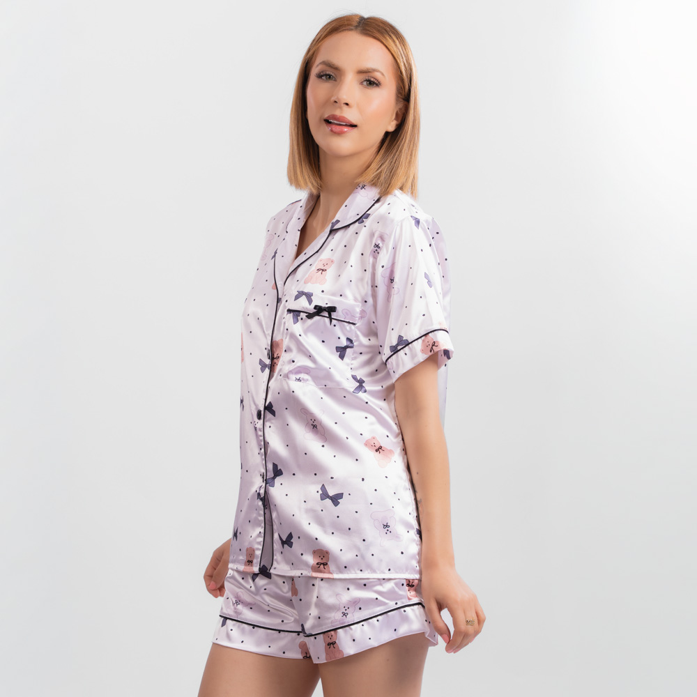 Hermosa Y delicada pijama tres piezas satinadas con delicado estampado de Oso, camisa manga corta, pantalón y short con resorte en la cintura, una pijama única y delicada, material suave y fresco, perfecta para la comodidad de tu hogar, ideal para tu plan de vacaciones, fiesta de pijama, material suave, un diseño que te hará sentir única, es una prenda que no puede faltar en tu closet.