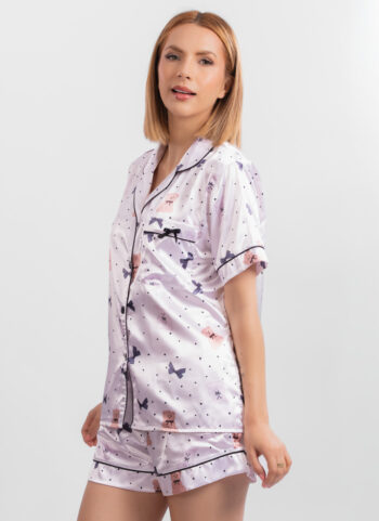 Hermosa Y delicada pijama tres piezas satinadas con delicado estampado de perritos, camisa manga corta, pantalón y short con resorte en la cintura, una pijama única y delicada, material suave y fresco, perfecta para la comodidad de tu hogar, ideal para tu plan de vacaciones, fiesta de pijama, material suave, un diseño que te hará sentir única, es una prenda que no puede faltar en tu closet.